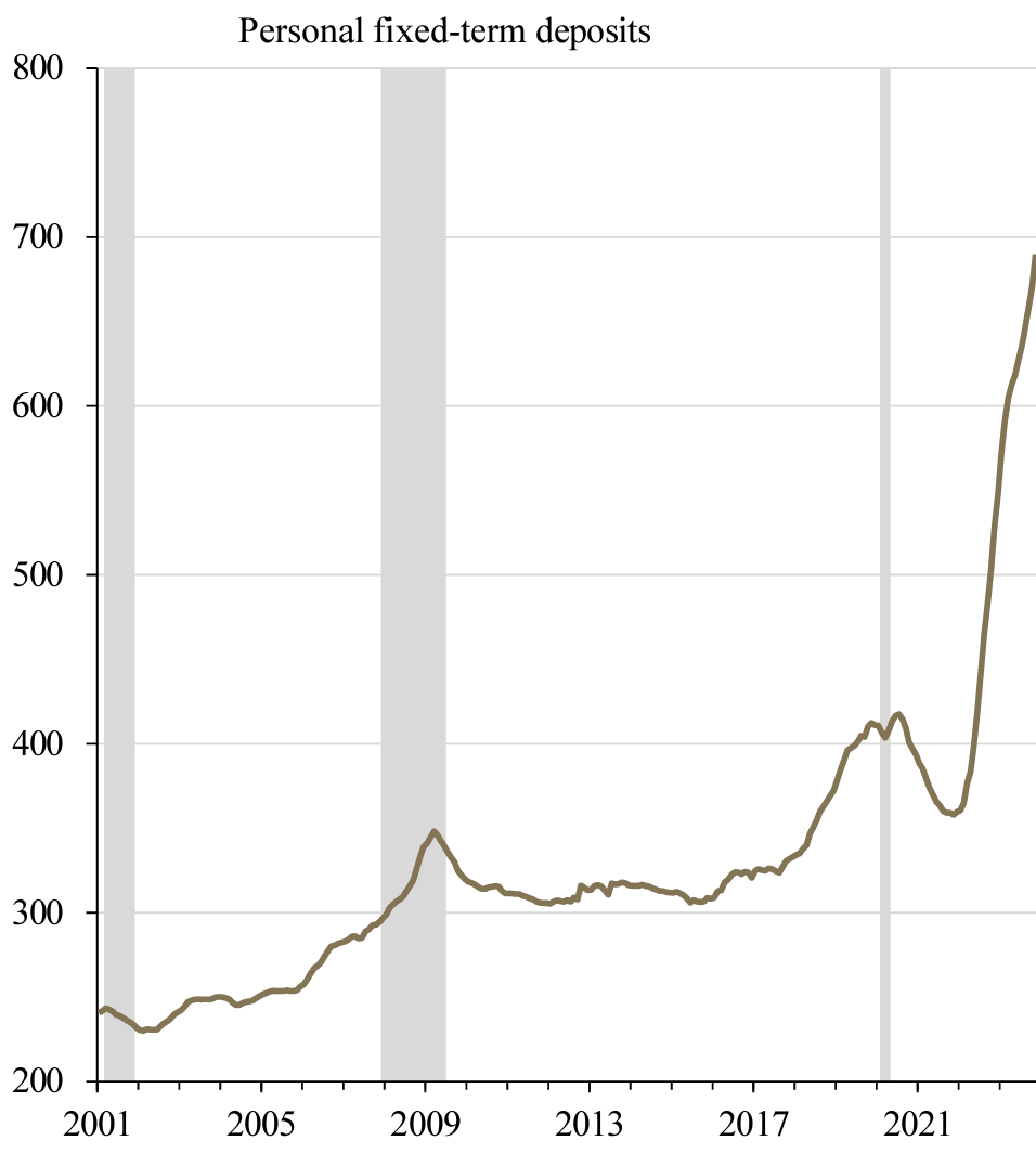 (Personal fixed-term deposits and money market fund* net assets, Canada; billions of Canadian dollars)