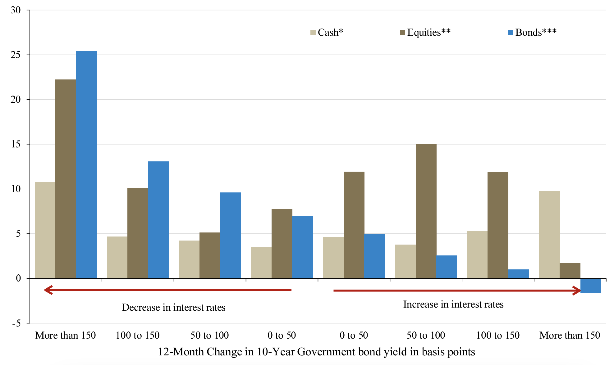 It is, however, only in these extreme market scenarios where cash has historically been the best option for investors. In periods of more modest increases in interest rates — which typically coincide with an upswing in the market cycle in which growth and inflation are rising, increasing the anticipation of central bank rate increases — equities are the top performer on average. The same holds true when rates stay roughly flat. Periods of declining rates — which typically coincide with more down economic outlooks that presage central banks easing policy — see bonds outperform.