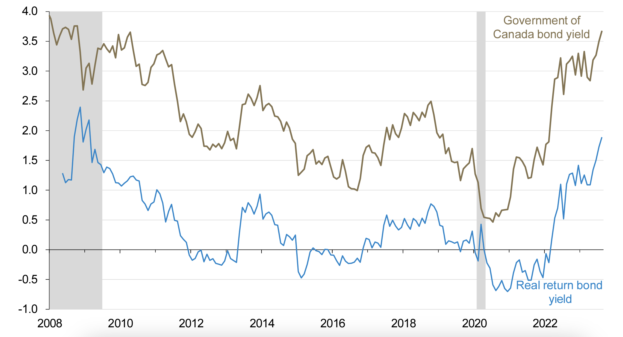 For much of the last decade, central banks’ zero interest rate policies and intervention in financial markets have kept bond yields at historically low levels. While Canada did not see negative nominal yields like in Europe and Japan, rates were still below (both actual and expected) inflation, which meant that real yields were less than zero (the average yield on a 10-year Government of Canada real return bond was -0.45% for the decade ended December 2022).