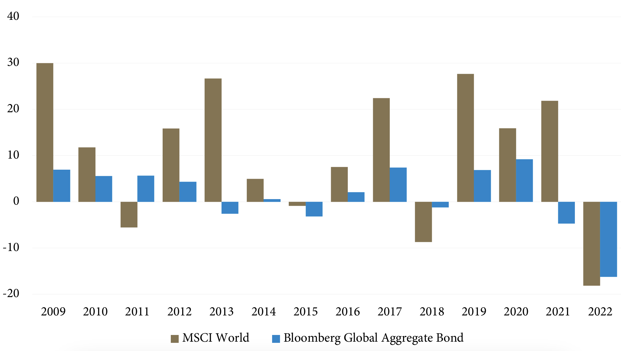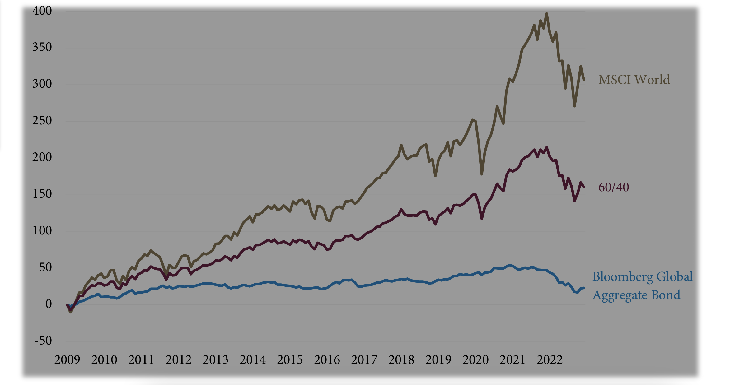 The era of extreme monetary accommodation that followed the Global Financial Crisis actually recorded more years in which bonds declined globally (five: 2013, 2015, 2018, 2021, and the historical drop in 2022) than “risky” stocks (four: 2011, 2015, 2018, and 2022). As would be expected, the environment resulted in cumulative equity returns since 2009 of 307% (MSCI World Index), significantly outpacing the cumulative bond return of 23% (Bloomberg Global Aggregate Bond Index).