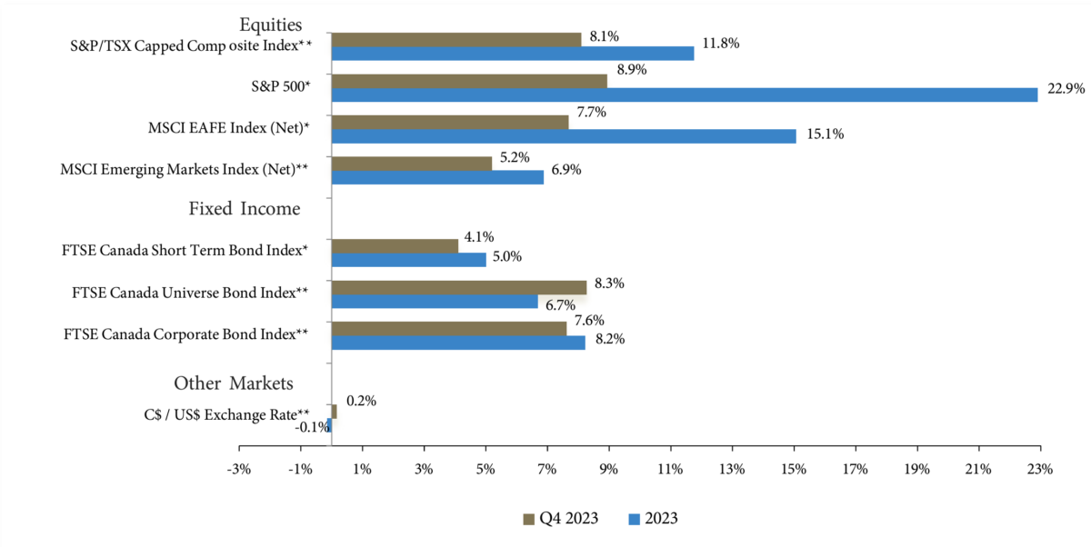 Closer to home, the TSX Composite index rose 8.1%, also propelled by an Information Technology sector that rose 24.0% in the quarter to bring full year gains to 36.0% for this cohort. In contrast to fairly narrow strength for most of the year, gains were widespread this quarter, with 10 of 11 sectors rising across the TSX and the S&P 500 benchmark, and all 11 sectors increasing across the MSCI EAFE index. Energy was the weakest group in all markets, tracking a 21.0% decline in the price of West Texas Intermediate (WTI) crude oil over the quarter as global demand, particularly out of China, seems to be ebbing.
