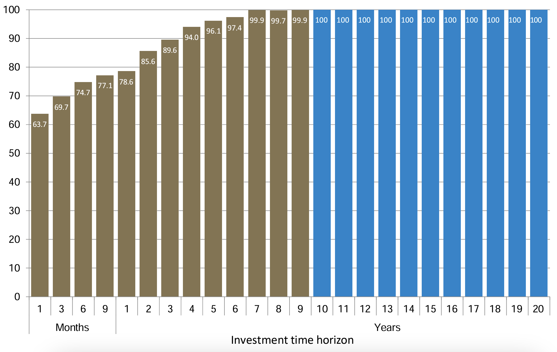 Percent of time S&P 500 total returns were positive over different investment horizons